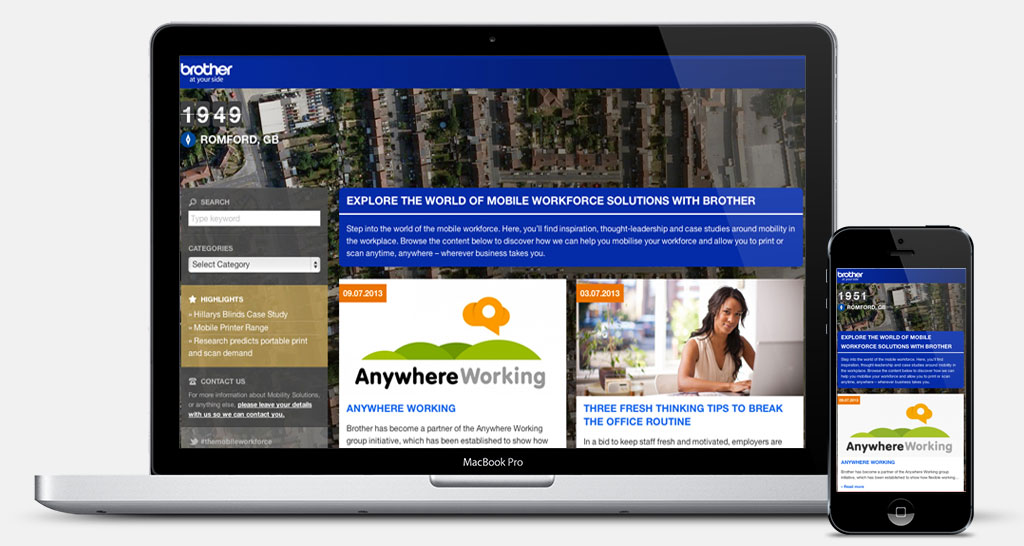 Brother Mobile Printer Website: Brother wanted a site to communicate information to their corporate audience highlighting the benefits of mobile printing for mobile workforces. As this was focussed on mobile printing it was imperative that this site was able to work successfully on mobile devices. The site uses Geo-location to display a unique background to every user based on where they are viewing the site in the UK.