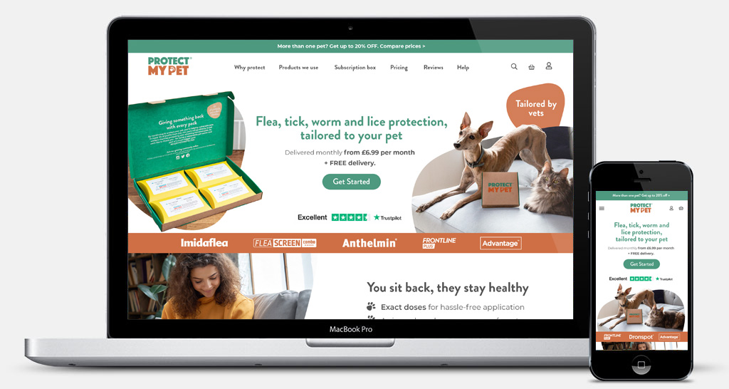 Protect My Pet rebrand and site redesign: A full brand overhaul including updates to packaging, advertising and the main brand website. Using a mobile first approach based on user research that showed the majority of customers accessed from a mobile the website was redesigned to appeal to the brands target demographic. With a heavy focus on usability and search engine optimisation the site was redesigned to reflect the updated brand style. This fully responsive site was designed and built as an agile project, enabling us to create a site that not only looked good but worked well across multiple devices. The rebrand also included updated packaging and a photoshoot to create branded assets to be used throughout the site and in advertising material.