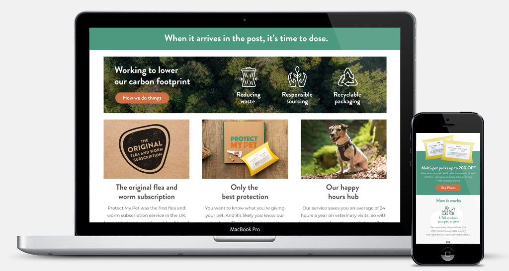 Protect My Pet rebrand and site redesign: A full brand overhaul including updates to packaging, advertising and the main brand website. Using a mobile first approach based on user research that showed the majority of customers accessed from a mobile the website was redesigned to appeal to the brands target demographic. With a heavy focus on usability and search engine optimisation the site was redesigned to reflect the updated brand style. This fully responsive site was designed and built as an agile project, enabling us to create a site that not only looked good but worked well across multiple devices. The rebrand also included updated packaging and a photoshoot to create branded assets to be used throughout the site and in advertising material.