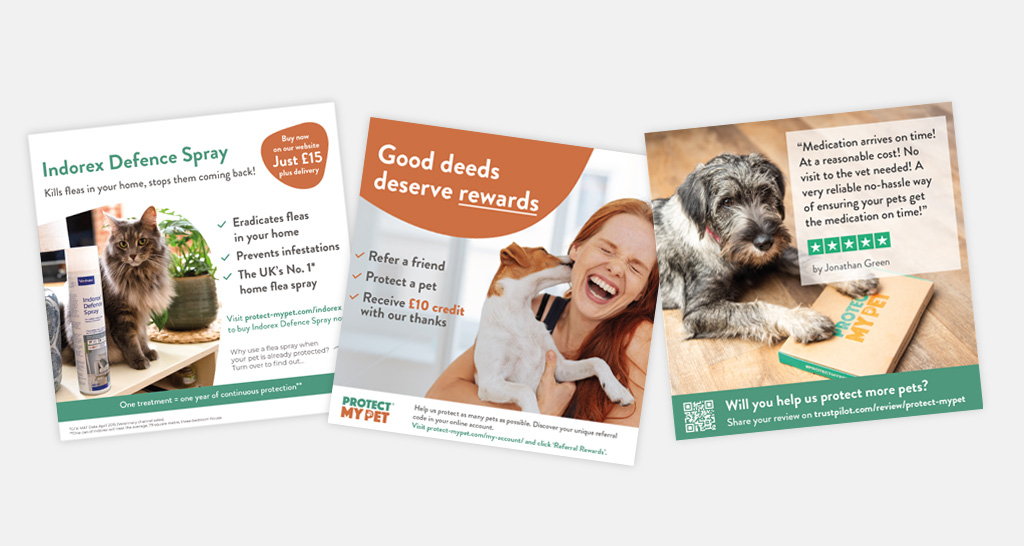 My involvement: Working as the Head of Design I was responsible for the rebrand of Protect My Pet. I worked closely with the Head of Copy to create a brand that appealed to the Protect My Pet audience as identified in user research that we were heavily involved in. From concept to final design I updated the brand to have consistency and user appeal whilst always keeping usability and user experience at the forefront of the project. Going forwards I regularly provide updates for the website and produce regular inserts that are included in the monthly boxes that are sent out with customer orders. I am also responsible for overseeing social output and art directing photo shoots.
