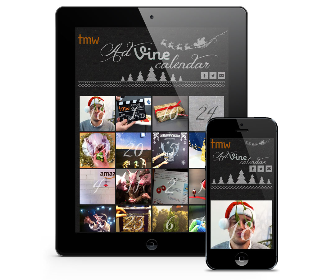 TMW Advine Calendar: Each year TMW look for innovative ways to wish their clients a Merry Christmas. December 2013 saw the agency use the app Vine to create a virtual advent calendar counting down to Christmas. Each day users could visit the website and click to open that date’s window, where they would be rewarded with a 6 second Vine created by a different member of the TMW Creative Department. Vines ranged from cute, clever or topical to the completely absurd. Supporting emails were also sent to clients to raise awareness of the website and wish them Season’s Greetings.
